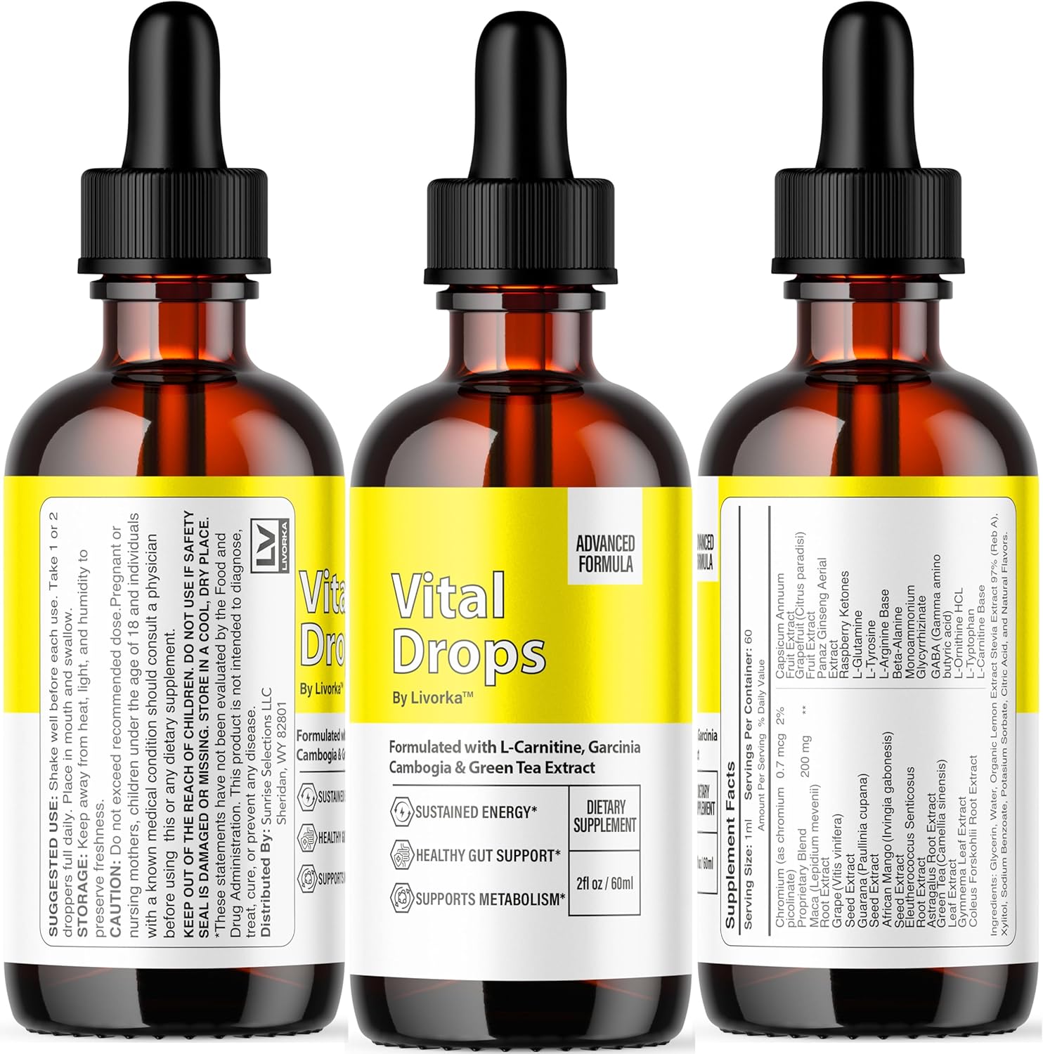 Retrouve ton équilibre naturel avec Vital Drops, une formule avancée à base de L-Carnitine, Garcinia Cambogia et extrait de thé vert.