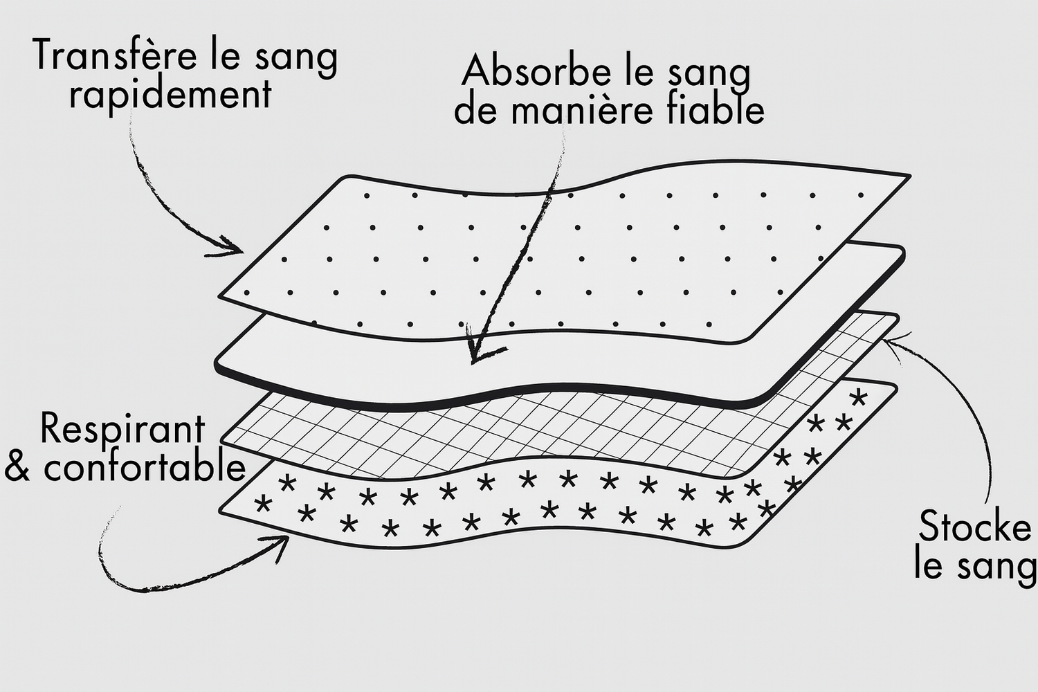 Elle est composée de plusieurs couches absorbantes : la première transfère le flux, la seconde l’absorbe, la troisième le stocke, tout en restant respirante et confortable.